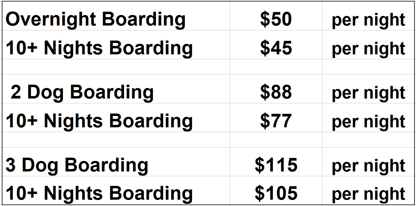 All boarding rates are per night and all payments are due when you drop your dog